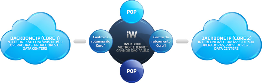 Focada na prestação de serviços de alta disponibilidade, a IW Telecom construiu seu backbone de última geração (IP & Metro Ethernet), que interliga seus pontos de presença através de anéis de alta capacidade, com convergência automática para contenção de falhas.